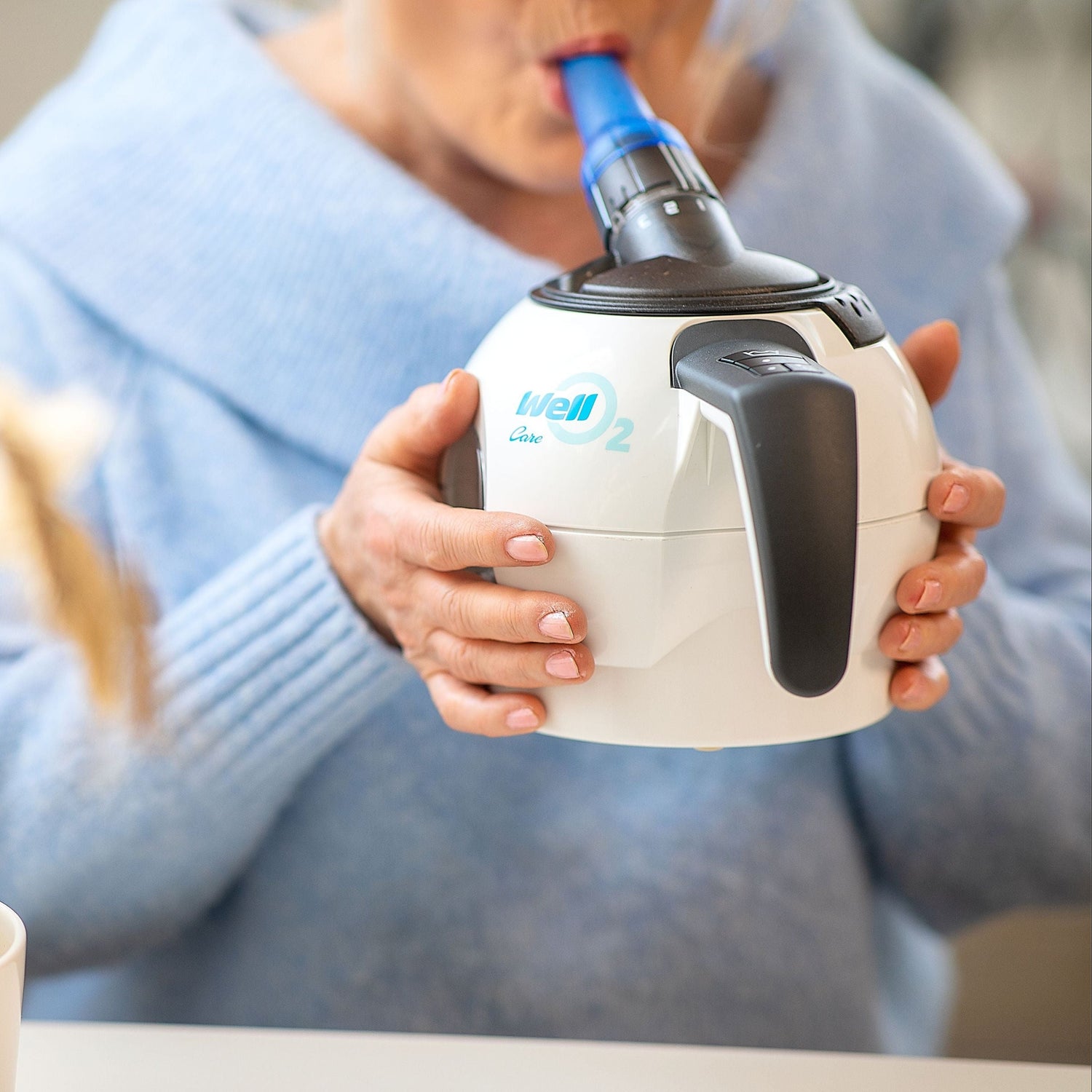 WellO2 is a lung-strengthening breathing exercise device that combines inspiratory and expiratory counter pressure breathing and the inhalation of warm steam. The device improves and maintains the condition of the respiratory system.